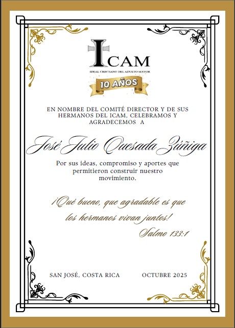 Este mes de octubre se cumplieron diez años de la fundación de nuestro ministerio de evangelización I.C.A.M. (Ideal Cristiano del Adulto Mayor) el cuál ha sido una bendición para muchos hombres adultos mayores que han asistido y asisten una vez al mes a la reunión del grupo. Aquí cuenta con un ambiente en sano y enfocado en Cristo en el que se comparte vida, experiencias y se recibe enseñanza para tener una mejor calidad de vida en esta feliz etapa.